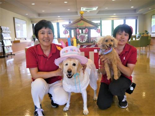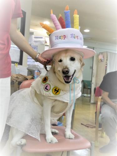 入所者の方とセラピー犬との触れ合いから生まれる笑顔いっぱいの様子が私たちの喜びです。私たち協会は犬とともに高齢者福祉に貢献していきたいと考えております。このたびは、8月生まれのテレサのお誕生日をみんなでお祝いしていただきました。ありがとうございました。