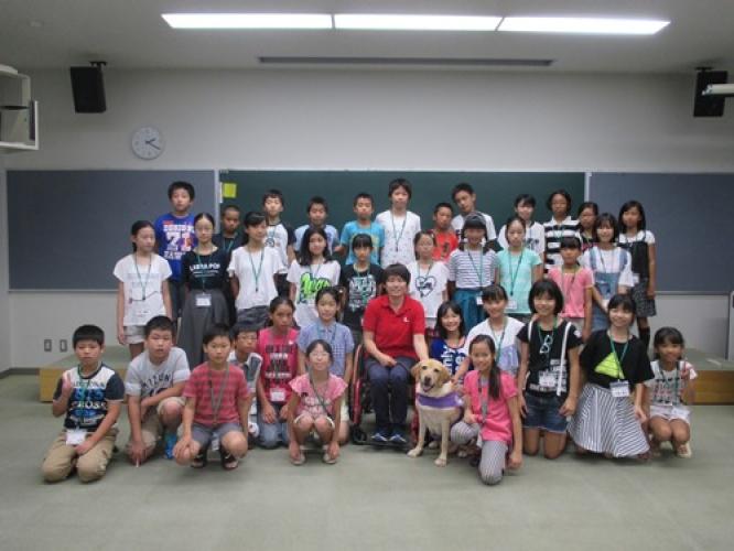 参加した小学生には、実際の介助犬と一緒に車いすで行動したり、物を拾ったりして介助犬との体験を経験して学習をしていただきました。