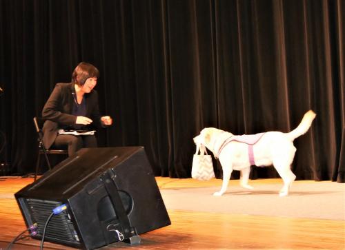 ステージで介助犬のお話と仕事をご紹介させていただきました。地元の皆様から暖かい励ましのお言葉や介助犬育成の募金のご協力をいただきました。