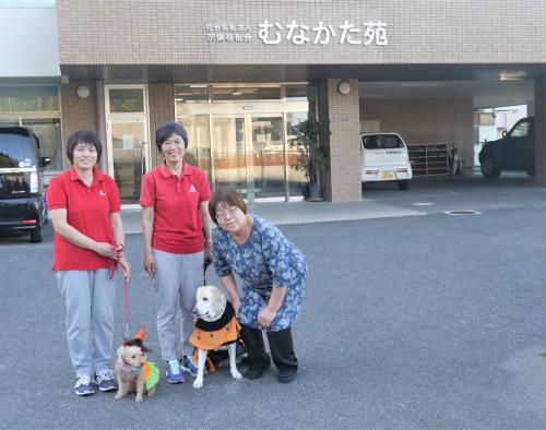 セラピー犬との触れ合いで利用者の皆様の笑顔の輪が広がり楽しいひと時を過ごすことができました。 今月はハロウィンなのでセラピー犬も仮装をして楽しい時間をすごしました。このたびセラピー犬活動の機会を提供していただきました「むなかた苑」の関係者の皆様に心より感謝申し上げます。