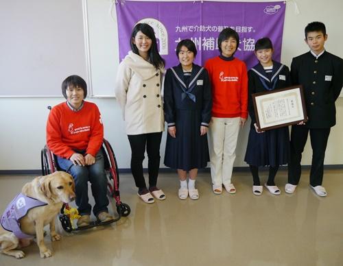 九州補助犬協会の介助犬の育成を支援は、今年で6年目になります。福岡市西区横浜の玄洋中学校の生徒、保護者の皆様が昨年末にJR筑肥線今宿駅前で募金活動を行って下さいました。当日の募金収益金と学校のPTAが実施された、バザーなどの収益金も合わせてご寄付をいただきました。