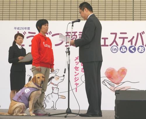 福岡市獣医師会では、体の不自由な方を支える介助犬へのご理解と当協会の活動に対するご支援を継続していただいております。贈呈式と同時に会場で介助犬啓発実演を行い参加者に介助犬の仕事ぶりをご紹介する機会を得ることが出来ました。福岡市獣医師会の関係者の皆様に心より感謝申し上げます。